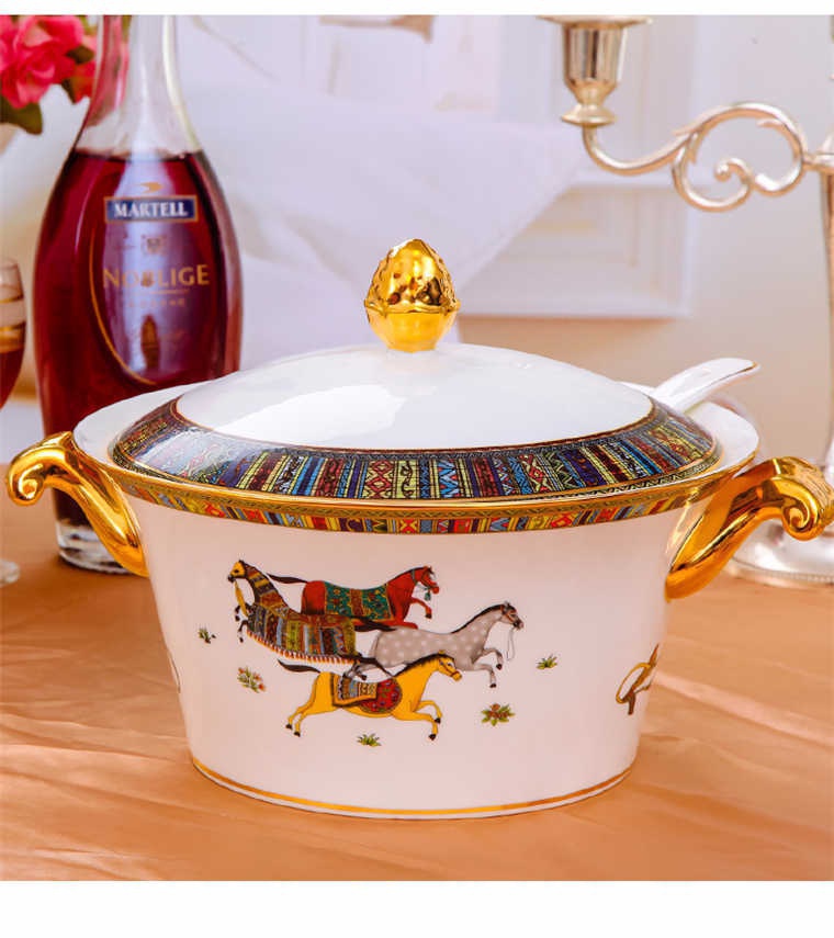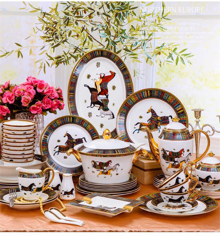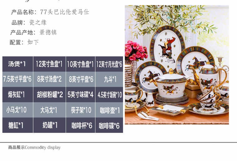77頭巴比倫愛(ài)馬仕,一個(gè)湯煲,一個(gè)12寸魚(yú)盤(pán),一個(gè)10寸魚(yú)盤(pán),六個(gè)12寸月光盤(pán),六個(gè)7.5寸平盤(pán),兩個(gè)8寸湯盤(pán),六個(gè)8寸平盤(pán),一個(gè)九斗,一個(gè)煙灰缸,兩個(gè)胡椒粉罐,四個(gè)5寸味碟,十個(gè)4.5寸飯碗,十個(gè)小馬戈,一個(gè)大馬戈,十個(gè)筷子架,一個(gè)咖啡壺,一個(gè)糖缸,一個(gè)奶罐,六個(gè)咖啡杯,六個(gè)咖啡碟。
