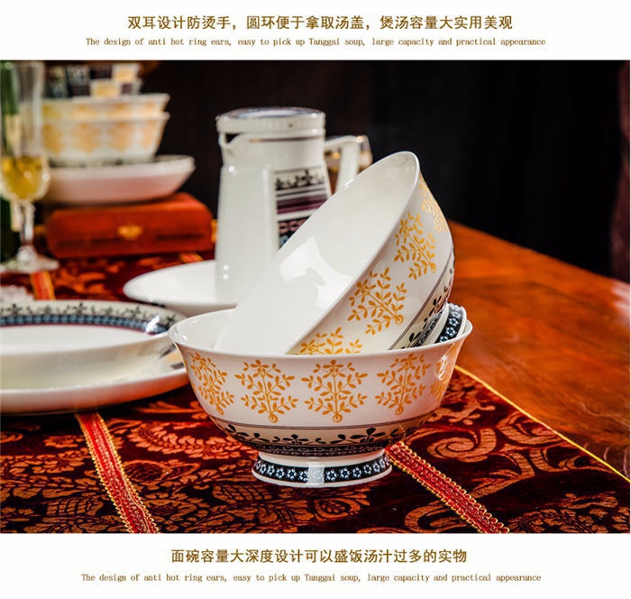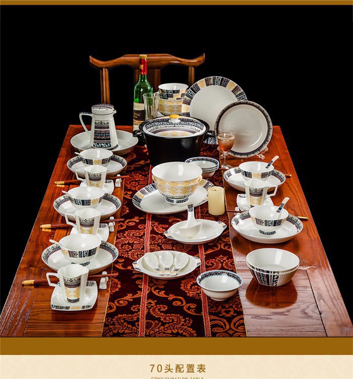 72頭傳奇餐具,餐具60頭 ,一個(gè)湯煲,一個(gè)魚盤,一個(gè)十寸圓盤,一個(gè)牙簽筒,一個(gè)花籃,一個(gè)大飯勺,兩個(gè)調(diào)料壺,兩個(gè)蓋碗,四個(gè)碗,十個(gè)4.5寸飯碗,十個(gè)4寸湯碗,十個(gè)8寸盤,十個(gè)調(diào)羹,十個(gè)筷子架,