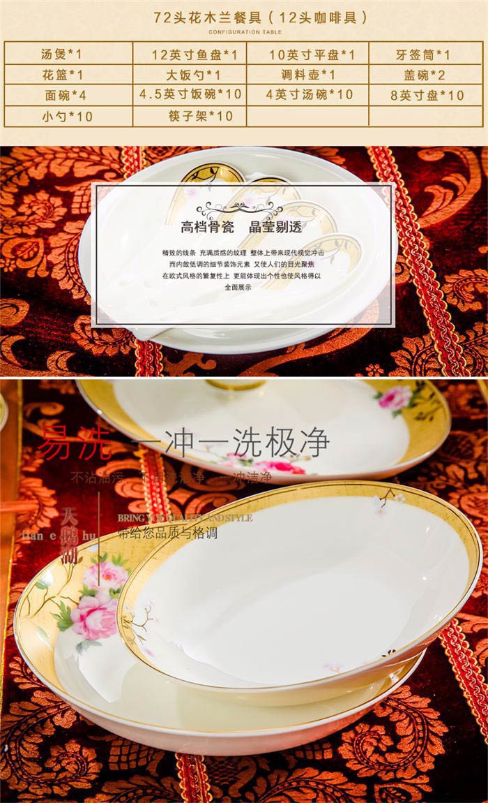 72頭花木蘭餐具,餐具60頭 ,一個(gè)湯煲,一個(gè)魚(yú)盤(pán),一個(gè)十寸圓盤(pán),一個(gè)牙簽筒,一個(gè)花籃,一個(gè)大飯勺,兩個(gè)調(diào)料壺,兩個(gè)蓋碗,四個(gè)碗,十個(gè)4.5寸飯碗,十個(gè)4寸湯碗,十個(gè)8寸盤(pán),十個(gè)調(diào)羹,十個(gè)筷子架,