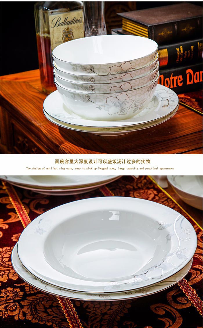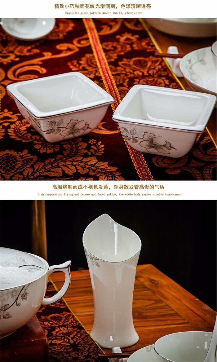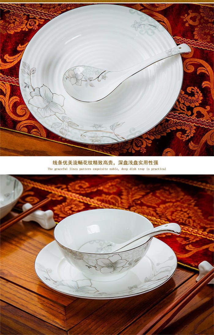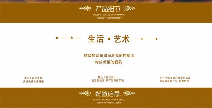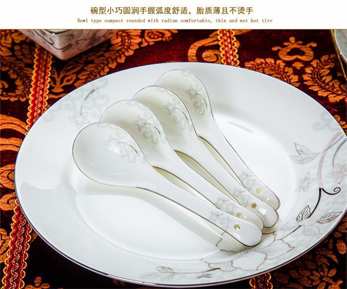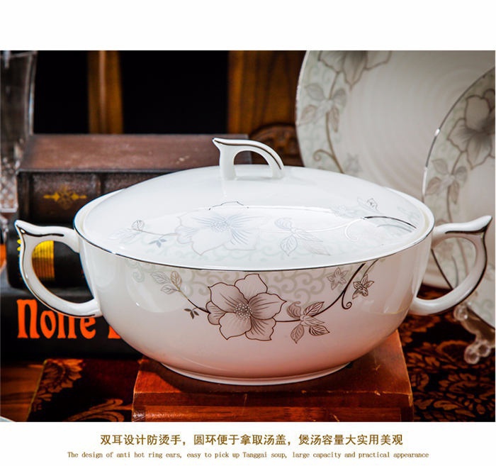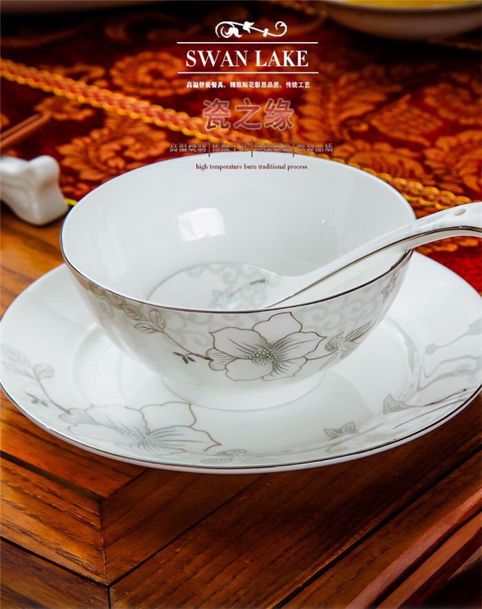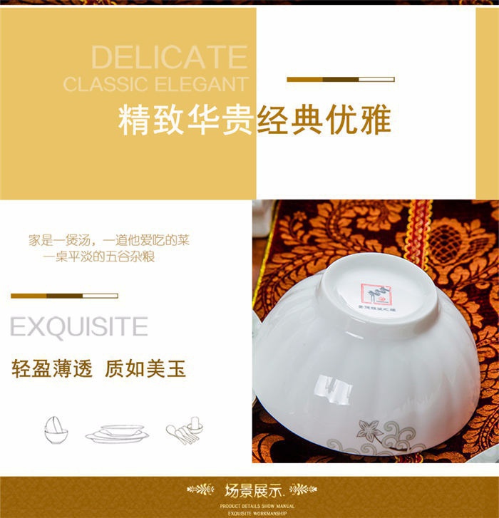 60頭佳人,一個(gè)湯煲,一個(gè)魚盤,一個(gè)十寸圓盤,一個(gè)飯勺,一個(gè)煙缸,一個(gè)筷子筒,六個(gè)五寸調(diào)味碟,四個(gè)沙拉碟,十個(gè)盤子,十個(gè)4.5寸飯碗,四個(gè)面碗,十個(gè)調(diào)羹,十個(gè)筷子架。