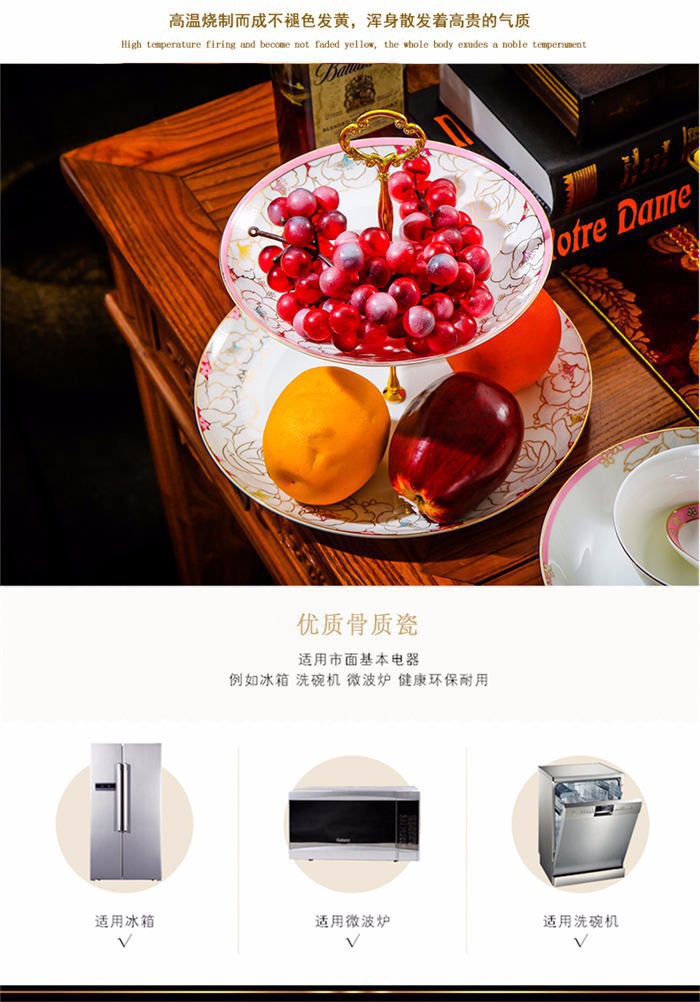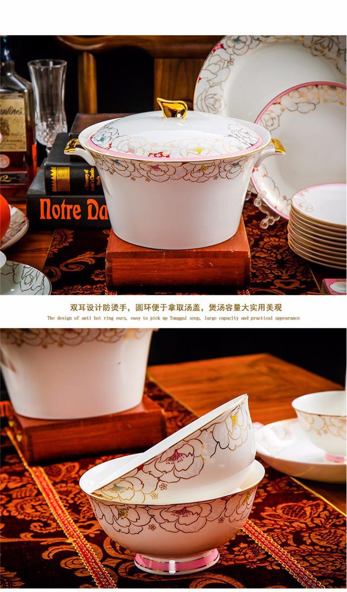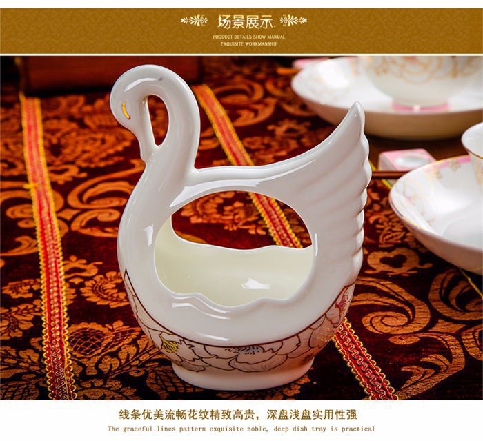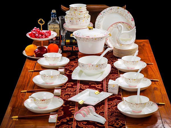 64頭凡爾賽玫瑰,一個(gè)湯煲,一個(gè)魚盤,一個(gè)十寸圓盤,一個(gè)飯勺,一個(gè)煙灰缸,兩個(gè)胡椒瓶,四個(gè)面碗,一個(gè)雙層水果盤,一個(gè)美鵝,十個(gè)4.5寸飯碗,十個(gè)五寸骨碟,十個(gè)八寸盤,十個(gè)調(diào)羹,十個(gè)筷子架。
