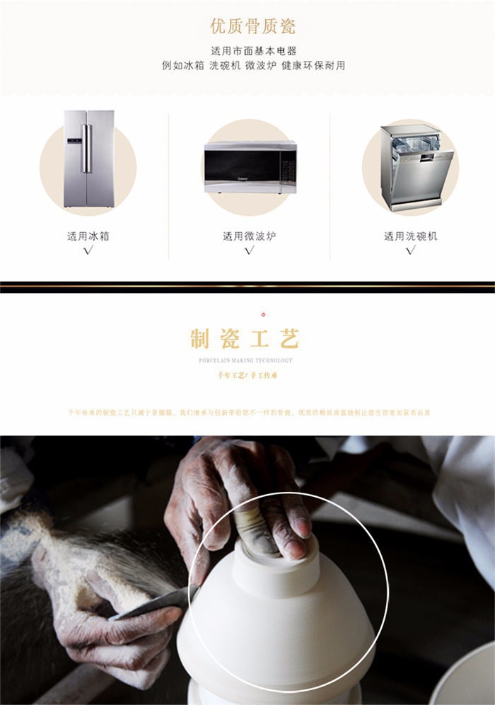 63頭景色滿園 一個湯煲,一個魚盤,一個十寸圓盤,一個飯勺,一個煙灰缸,兩個胡椒瓶,四個面碗,一個雙層水果盤,一個美鵝,十個4.5寸飯碗,十個五寸骨碟,十個八寸盤,十個調(diào)羹,十個筷子架。