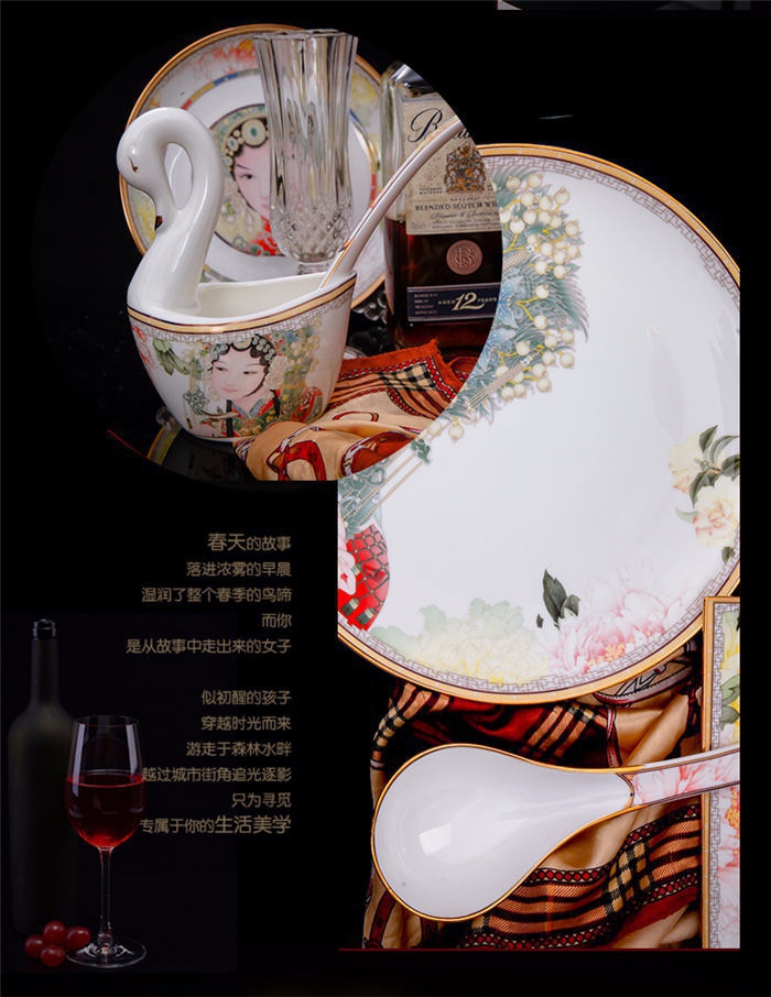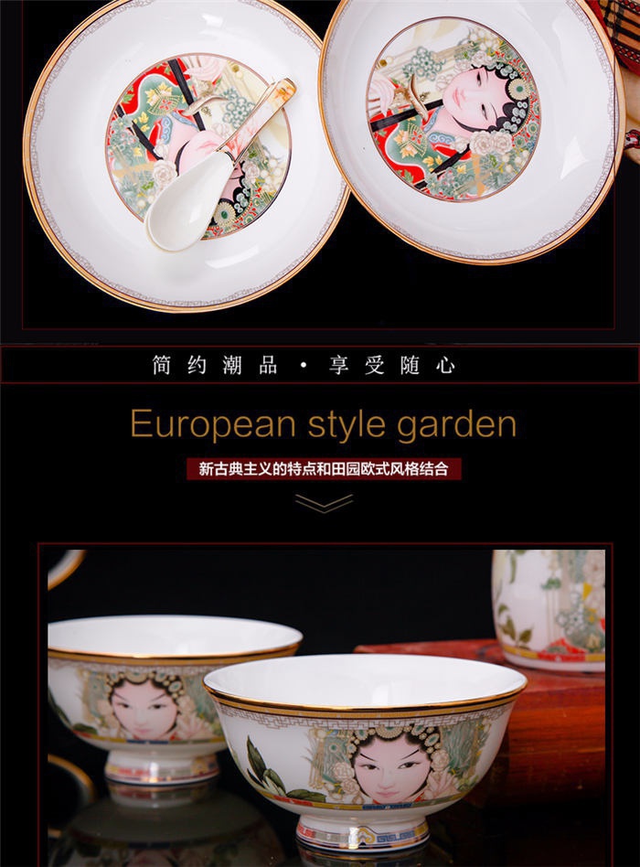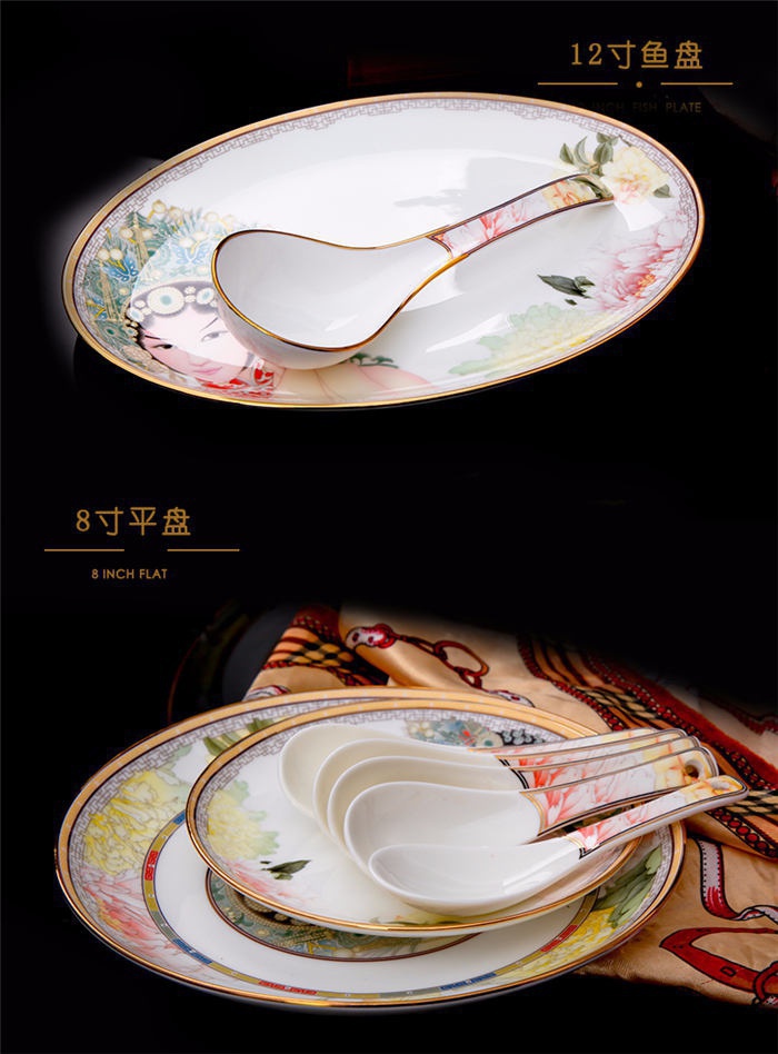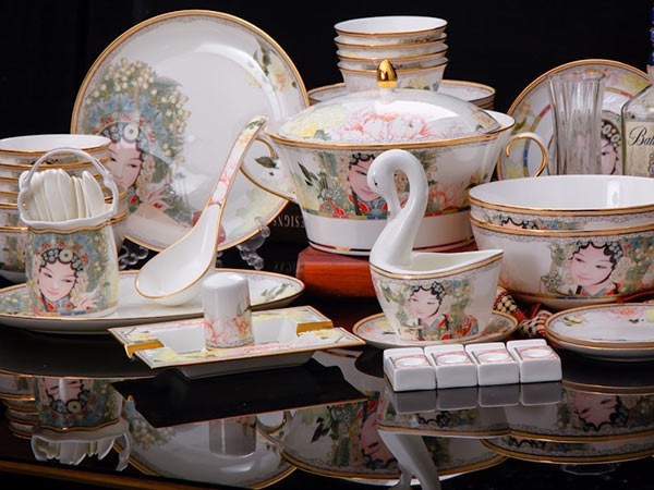 60頭臉譜,一個(gè)湯煲,一個(gè)飯勺,一個(gè)魚(yú)盤(pán),一個(gè)十寸平盤(pán),一個(gè)牙簽筒,一個(gè)煙灰缸,兩個(gè)面碗,兩個(gè)大湯碗,一個(gè)花籃,一個(gè)鳥(niǎo),八塊八寸盤(pán),十個(gè)4.5寸飯碗,十個(gè)骨碟,十個(gè)調(diào)羹,十個(gè)筷子架。