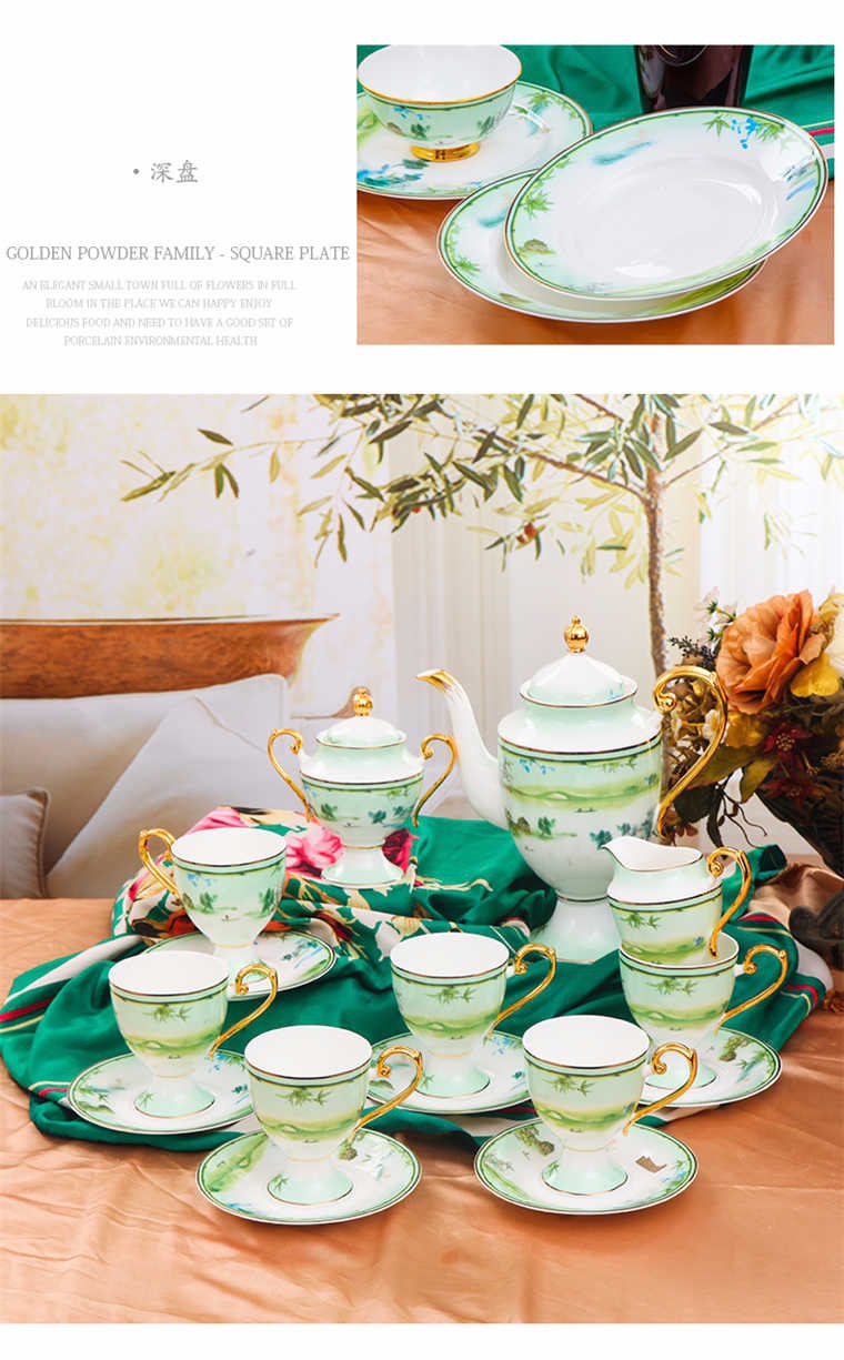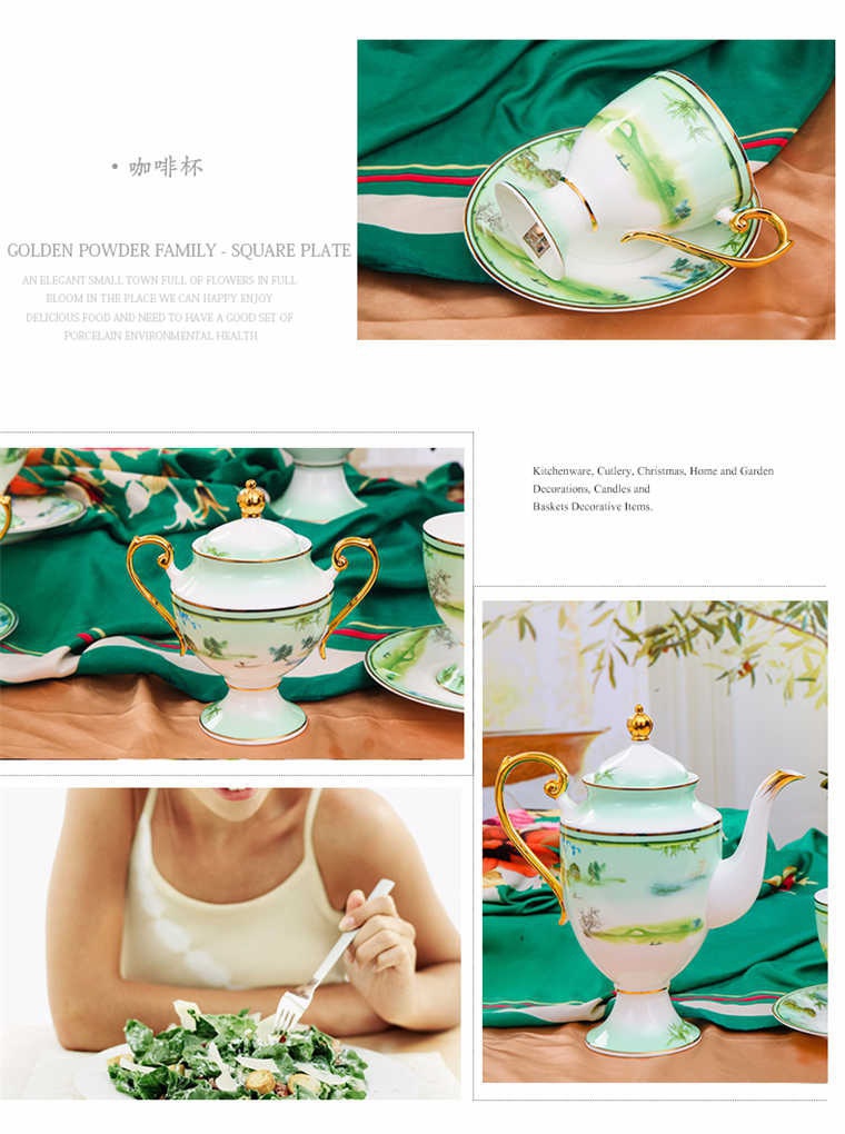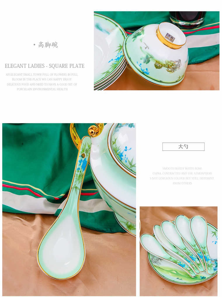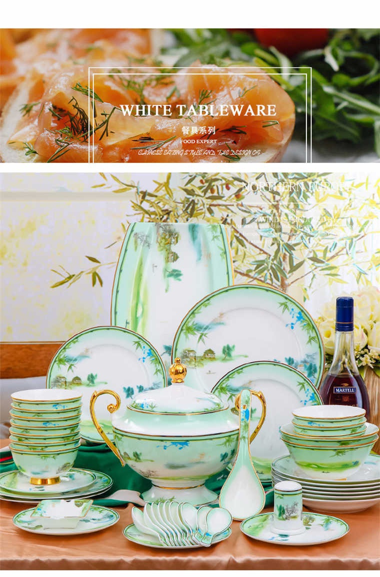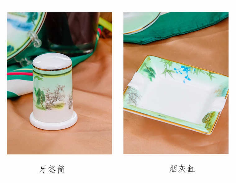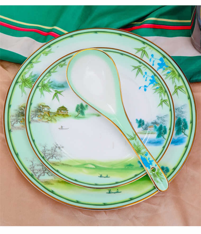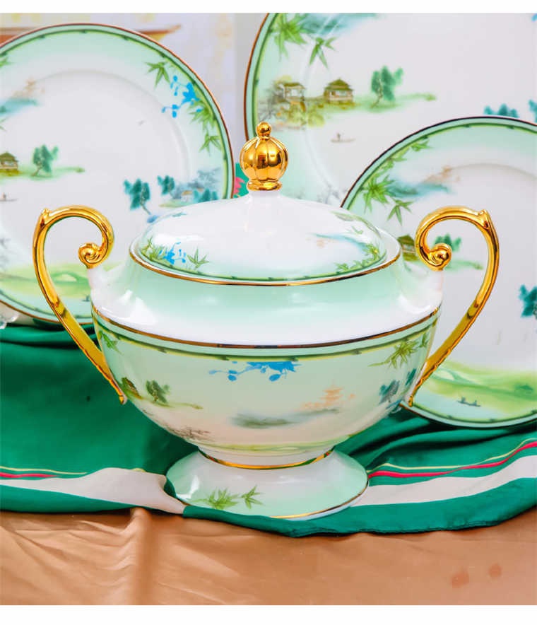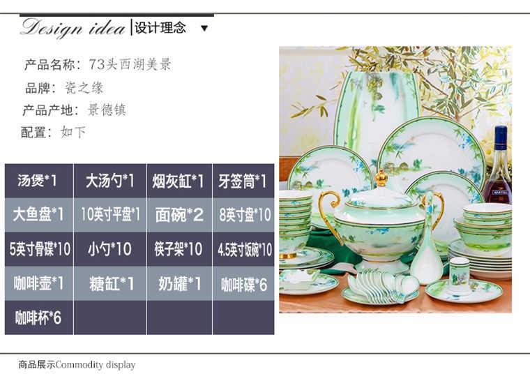 73頭西湖美景,一個湯煲,一個大湯勺,一個煙缸,一個牙簽筒,一個魚盤,一個10寸平盤,兩個面碗,十個8寸盤,十個5寸骨碟,十個4.5寸飯碗,十個小勺,十個筷子架,一個咖啡壺,一個糖缸,一個奶罐,六個咖啡杯,六個碟。