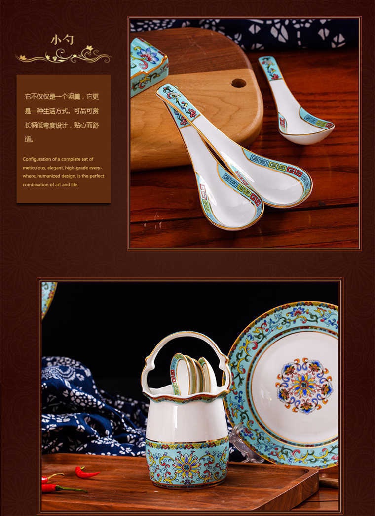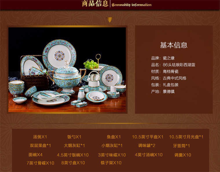 86頭琺瑯彩西湖藍(lán),一個(gè)湯煲,一個(gè)飯勺,一個(gè)魚(yú)盤(pán),一個(gè)10.5寸平盤(pán),一個(gè)10.5寸月光盤(pán),雙層果盤(pán)一個(gè),一個(gè)大煙缸,一個(gè)小煙缸,二個(gè)調(diào)料罐,一個(gè)牙簽筒,四個(gè)面碗,十個(gè)4.5寸飯碗,十個(gè)三寸調(diào)味碟,十個(gè)4寸湯碗,十個(gè)調(diào)羹,十個(gè)7寸骨碟,十個(gè)八寸盤(pán),十個(gè)筷子架.